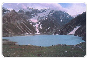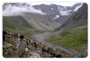 40.2 km from Pahalgam , anotherfull day walk from Sheeshnag, tented accommodation and other facilities available for yatries. A stream here joins another four streams.It is believed that Lord Shiva was performing Tandav Nritya. the cosmic dance of destruction, his locks got disheveled from which the five stream came down. Its considered auspicious to bathe in these holy streams. |
